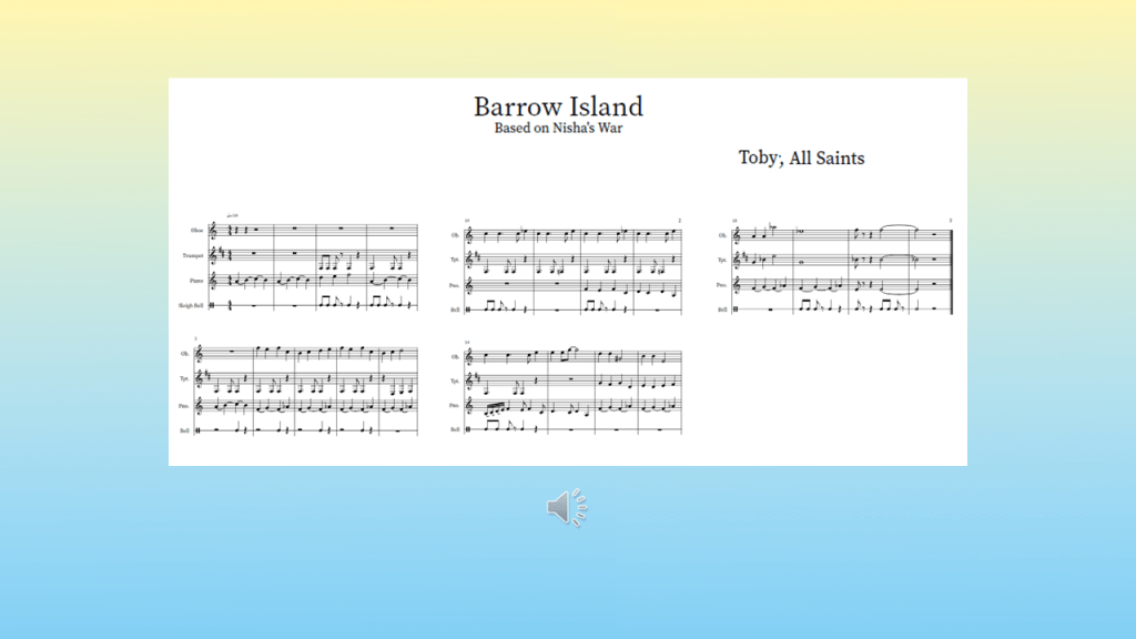 Toby, from All Saints RC School, for his wonderful musical arrangement “Barrow Island”, based on Nisha’s War by Dan Smith.